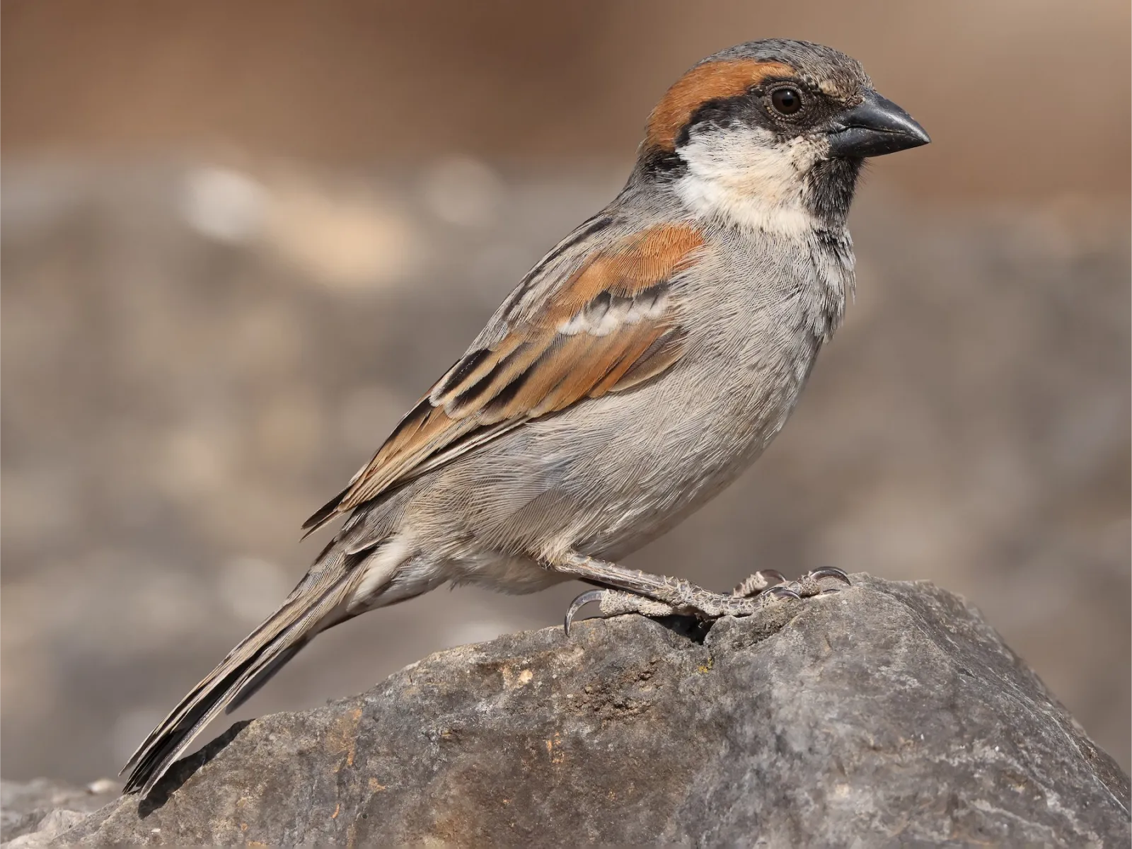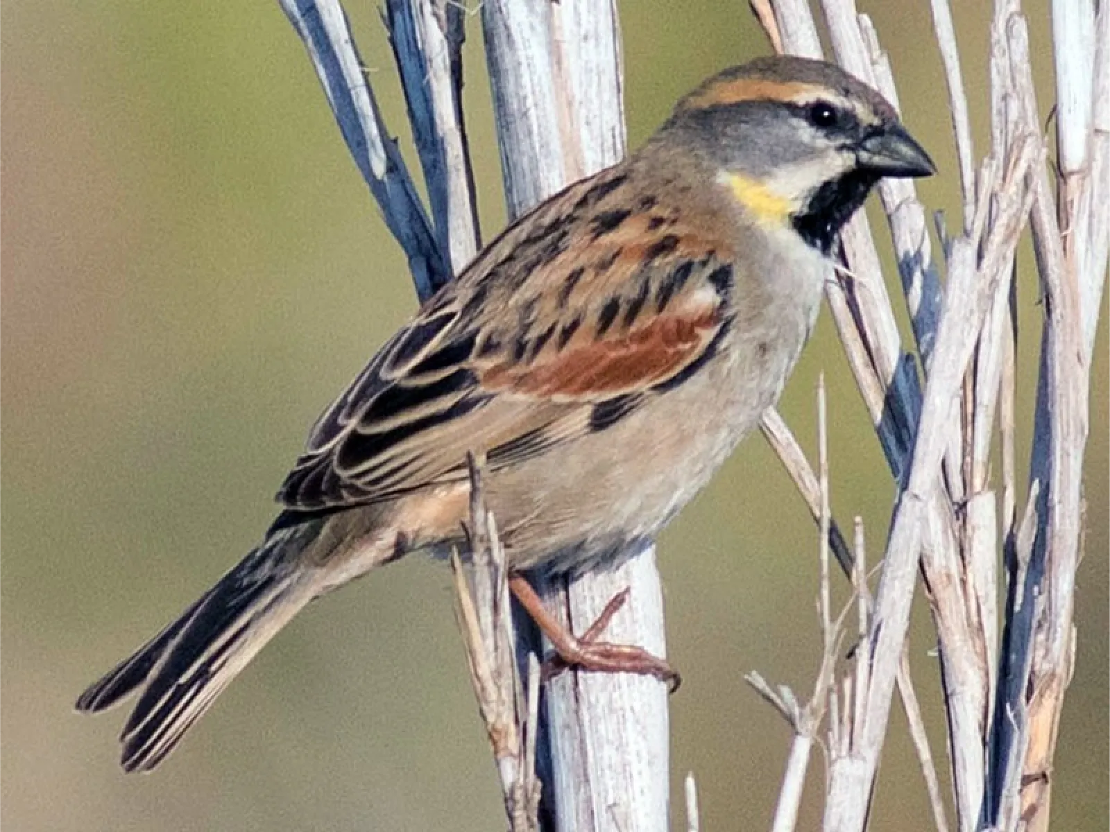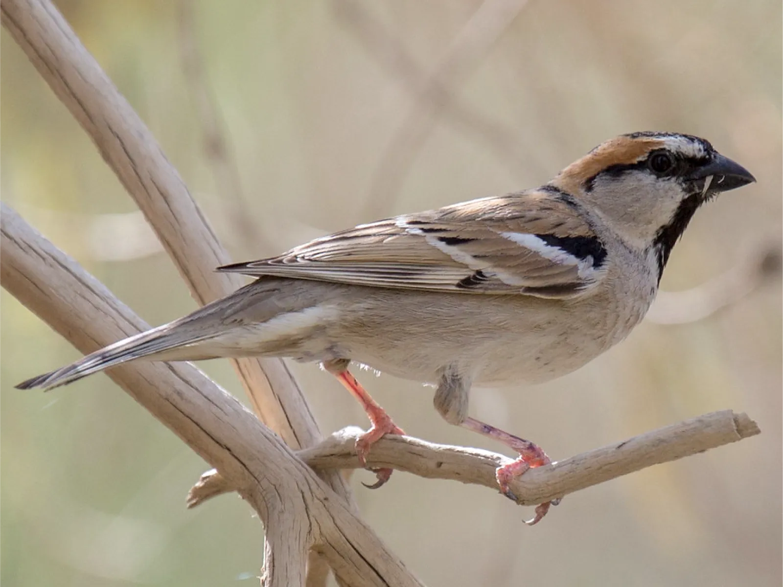 Found in the grasslands and scrub of North Africa and the Middle East, this sparrow prefers open, dry habitats with sparse vegetation. It is often seen in small groups foraging for food.